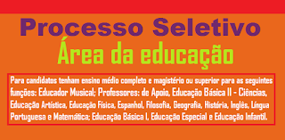 A Prefeitura de Pirapora do Bom Jesus - SP abre Processo Seletivo com intuito de preencher vagas disponíveis na área da educação. O requisito é que os candidatos tenham ensino médio completo e magistério ou superior para as seguintes funções: Educador Musical; Professores: de Apoio, Educação Básica II - Ciências, Educação Artística, Educação Física, Espanhol, Filosofia, Geografia, História, Inglês, Língua Portuguesa e Matemática; Educação Básica I, Educação Especial e Educação Infantil.