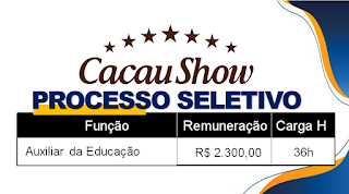 O Instituto Cacau Show que atende a centenas de estudantes da rede pública de ensino de Itapevi/SP, publica novo comunicado de abertura de processo seletivo para o provimento de vaga para a função de Auxiliar da educação, o cargo é denominado pelo instituto como Educador(a) Auxiliar.